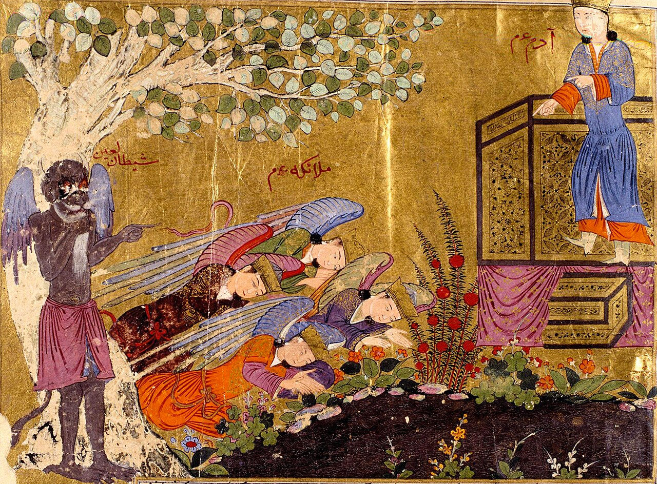 Maʿrūf Baghdādī, Angels bowing to Adam, except Iblīs, who refuses. Topkapı Palace Museum, Istanbul, MS Bağdat 282 fol. 16r.